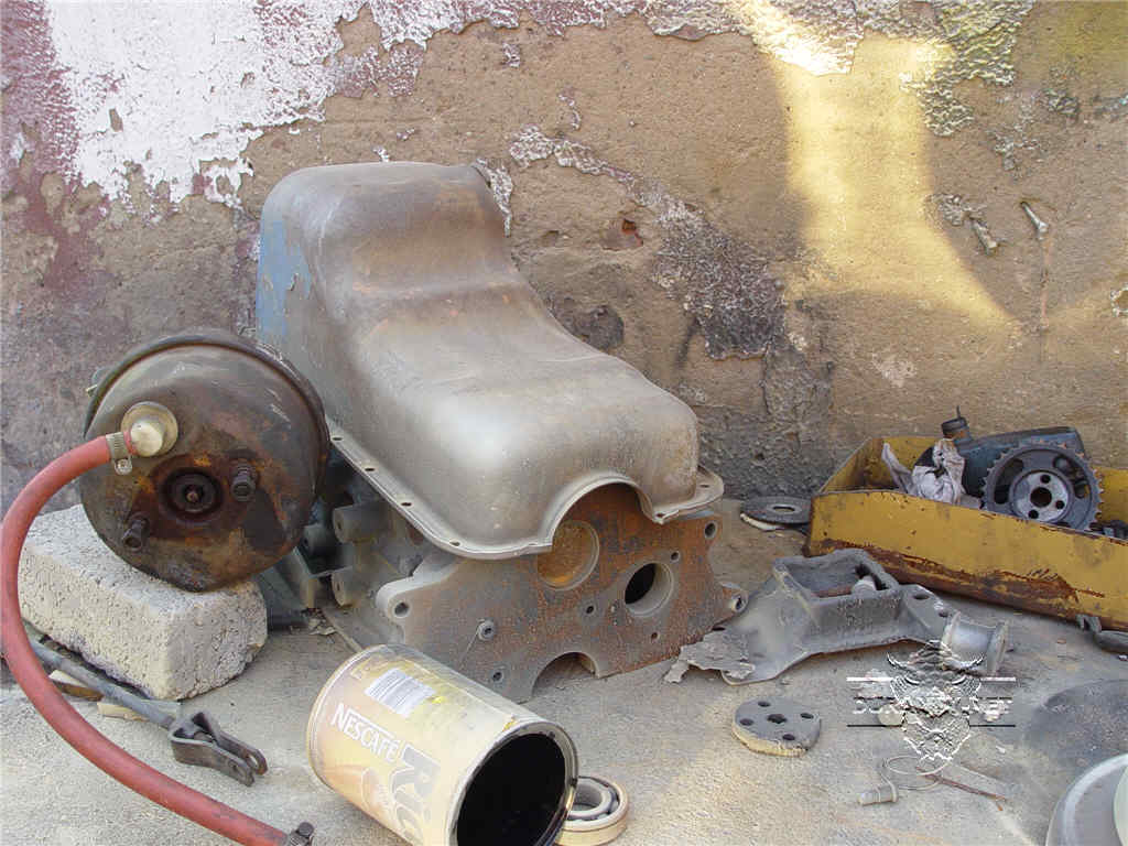 Her motor is in pieces, most of the parts so badly worn that they need replcement. The engine block has tiny holes between the cylinders as a result of many years of wear and rust. Given the condition of the motor, a replacement will be required and I'm hoping to find a 1600 motor complete in good condition...but I'll probably find a good set of chicken's teeth first.